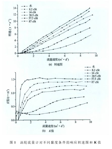 圖1渦輪流量計對不同黏度條件的響應(yīng)轉(zhuǎn)速圖和K值