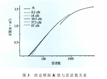 圖3理論模擬K值與雷諾數(shù)關(guān)系是,在低流量條件下,渦輪流量計在啟動時葉片相對于來流攻角較大,會產(chǎn)生流動分離的現(xiàn)象,此時會使得渦輪流量計的響應(yīng)有一定的波動和偏差。因而,采用黏度較高的黏性流體,在不同雷諾數(shù)條件下進行標(biāo)定之后,就可以對該渦輪對于不同黏性流體的響應(yīng)情況進行分析和計算。