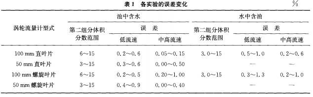 油水混合液在水平管道內靜止時油和水是分層的;在開始流動或很低流速時處于油水兩層的分層流;隨著流速增加油水逐漸混合,流速愈大兩相混合愈均勻;當進入渦輪葉片轉動時兩相混合將更為均勻。因此,混合液兩相均勻程度是影響測量誤差的因素之一。