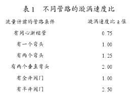 式中:L—上游直管段長度;f—管道內摩擦系數,處于紊流狀態時f=0.0175;Dg—流量計的公稱直徑;k—漩渦速度比,由流量計前管路情況確定(見表1)。