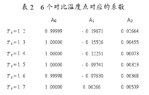 Z值可根據通用曲線圖確定或利用狀態方程算出。為計算方便,多采用對曲線進行二次擬合的方法來近似求得Z值。在求解Z值的時候,在所研究的對比溫度的范圍內選取了6個均勻分布于研究范圍內的Tr點為參照點(見表2),得到Z與Pr之間的簡單函數關系。通過數據分析,利用*小二乘法對曲線進行擬合,得到Z求值公式如下: