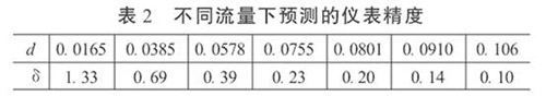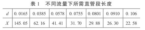 3.直管段長度和漂白劑流量計精度的初步預測在工程設計中,根據流體性質、流量和雷諾數確定α和d值。這樣,按照式(5)就可以依不同的流量計精度要求,對直管段長度進行初步預測,或確定直管段長度后,對流量計的精度做初步預測。當δ= 0.2%時,不同流量下所需直管段長度見表1。