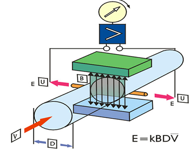 用水流量計工作原理是法拉*電磁感應定律,即導體在磁場中切割磁力線運動時,在導體兩端會感應一個與磁場方向和導體運動方向相互垂直的感應電動勢。感應電動勢的大小與感應強度和運動速度成正比。導電性液體在垂直于磁場的非磁性測量管內流動,與流動方向垂直的方向上產生與流量成比例的感應電勢,其值如下式:
