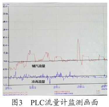通過圖3 PLC 流量計監測畫面可以看出,PLC 上輔汽測量用的氣體渦輪流量表的量程設置為30t/h,現場設備量程實際為6t/h,兩者嚴重不符,因此測量值4t/h 為錯誤值(單臺機組運行),需要對程序進行修改。