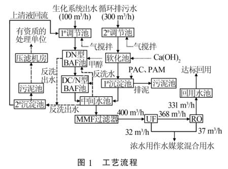 2種廢水在中間水池混勻后,通過泵提升進入保安過濾器,進一步去除細小的懸浮物后經過增壓泵進入超濾膜(UF)處理系統和反滲透(RO)系統,然后通過花生油流量計進行計量。反滲透出水直接進入回用水池達標回用,超濾濃水以及反滲透濃水用作水煤漿混合用水。污泥池中的污泥通過泵打入帶式機壓濾處理,濾液自流進入1#調節池。工藝流程見圖1。