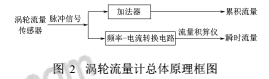 渦輪的旋轉角速度是通過裝在機殼外的傳感線圈來檢測。當渦輪葉片切割由殼體內永久磁鋼產生的磁力線時,就會引起傳感線圈中的磁通變化。傳感線圈將檢測到的磁通周期變化信號送入前置放大器,對信號進行放大、整形,產生與流速成正比的脈沖信號,送入單位換算與流量積算電路得到并顯示累積流量值;同時亦將脈沖信號送入頻率電流轉換電路,將脈沖信號轉換成模擬電流量,進而指示瞬時流量值。圖2為渦輪流量計總體原理框圖。