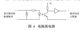 根據分析和實驗證明,干擾信號的進入,主要因為脈沖轉換器的電源由檢定裝置的直流穩壓電源提供,電壓脈沖信號直接傳送至脈沖計數器,電網中高次諧波的干擾會經過直流穩壓電源進入脈沖轉換器,從而串入正常的脈沖當中。另外,脈沖轉換器與脈沖計數器之間的連接線,也不可避免地感應到干擾信號。一種消除此類干擾的措施是斷開脈沖轉換器與檢定裝置之間的直接電的連接,采用電隔離的信號傳輸方式傳送脈沖信號,能夠有效隔絕干擾脈沖的進入。另一種采用光耦合器件的隔離電路如圖4所示: