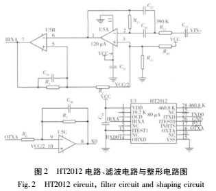 HART協議通信模塊主要由HART調制解調器HT2012和D/A轉換器AD421及其外圍電路實現。HART MODEM采用Smar公司的HT2012,是符合Bell202標準的半雙工調制解調器,實現HART協議規定的數字通信的編碼或譯碼。該芯片專為HART儀器設計,片內集成了符合Bell202標準的調制器、解調器、時鐘及定時電路、檢測控制電路,性價比較高。其中AD421通過串行接口接收現場儀表內部MCU傳送的數字信號,轉換成4~20mA電流輸出,輸出主要的測量結果。HT2012則從VIN-節點接收疊加在4~20mA環路上的信號,對其帶通濾波和放大之后進行載波檢測,如果檢測到FSK頻移鍵控信號,則將IRXA節點上的 1.2kHz的信號解調為‘1’,將IRXA節點上的2.2kHz信號解調為‘0 ’,并通過串口通信RXD0節點傳輸給C8051F020,C8051F020接收命令幀并作相應的數據處理。之后,C8051F020產生要發回的應答幀,應答幀的數字信號由HT2012調制成相應的1.2kHz和2.2kHz的頻移鍵控(FSK)信號,即節點TXD0到節點OTXA的調制過程,并經過發送信號整形電路進行波形整形后,經AD421疊加在環路上發送。C8051F020外接1.8432MHz晶振,4分頻后作為HART調制解調的時鐘信號源,電路圖如圖2所示。