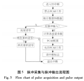 HART通信協議采用問答式,即上位機(主機)向下位機發出命令,下位機(從機)回答。主機消息到來時,通過觸發串口中斷來接收和發送數據。主循環程序還包括檢測溫度并送LCD顯示的子程序模塊,4~20mA電流輸出子程序模塊,累計流量寫鐵電子程序模塊等。系統主函數流程圖如圖4所示,脈沖采集、脈沖輸出流程圖如圖5所示。