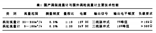 電池供電渦輪流量計(jì)與國(guó)外渦輪流量計(jì)的主要技術(shù)性能如表l所示。表1中為采用公稱(chēng)直徑為100的傳感器測(cè)量范圍。