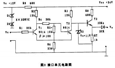 調(diào)試時(shí),先將接口單元的輸出端接1k電阻,然后將輸入端接1.5V電壓,逐步減小電阻R5的值,直至輸出端電壓上升到10V;若不能達(dá)到此值,則可能是三*管T3的直流放大倍數(shù)過(guò)低。逐步降低輸入端的電壓直至1.2V,此時(shí)輸出端應(yīng)為零。若不能可靠地回零,則可能是電阻R5的值過(guò)小。